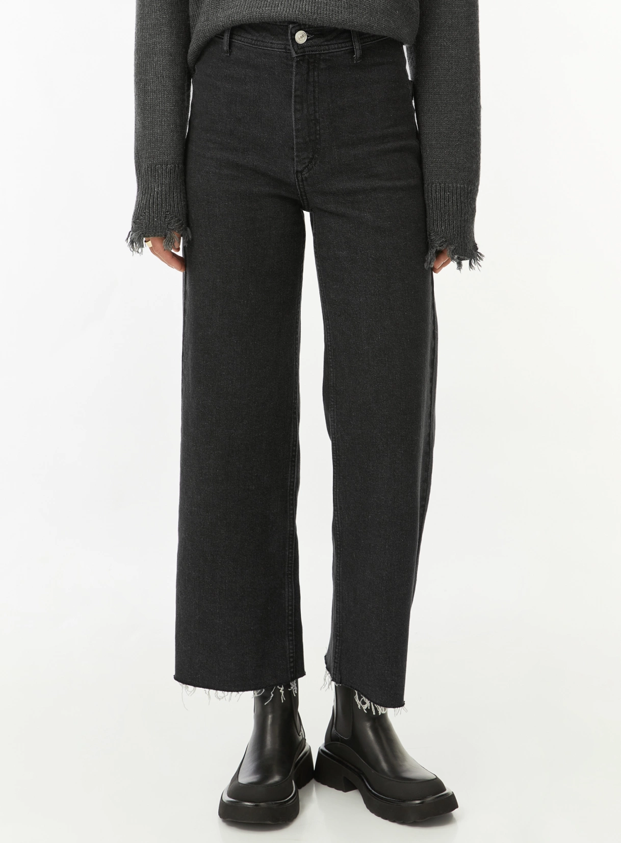 Model’s measurements in the photo: Size S, Height 178 cm, Bust/Waist/Hips – 85/60/90 cm. DESCRIPTION Cropped, wide-leg jeans with a raw hem. The jeans fasten…